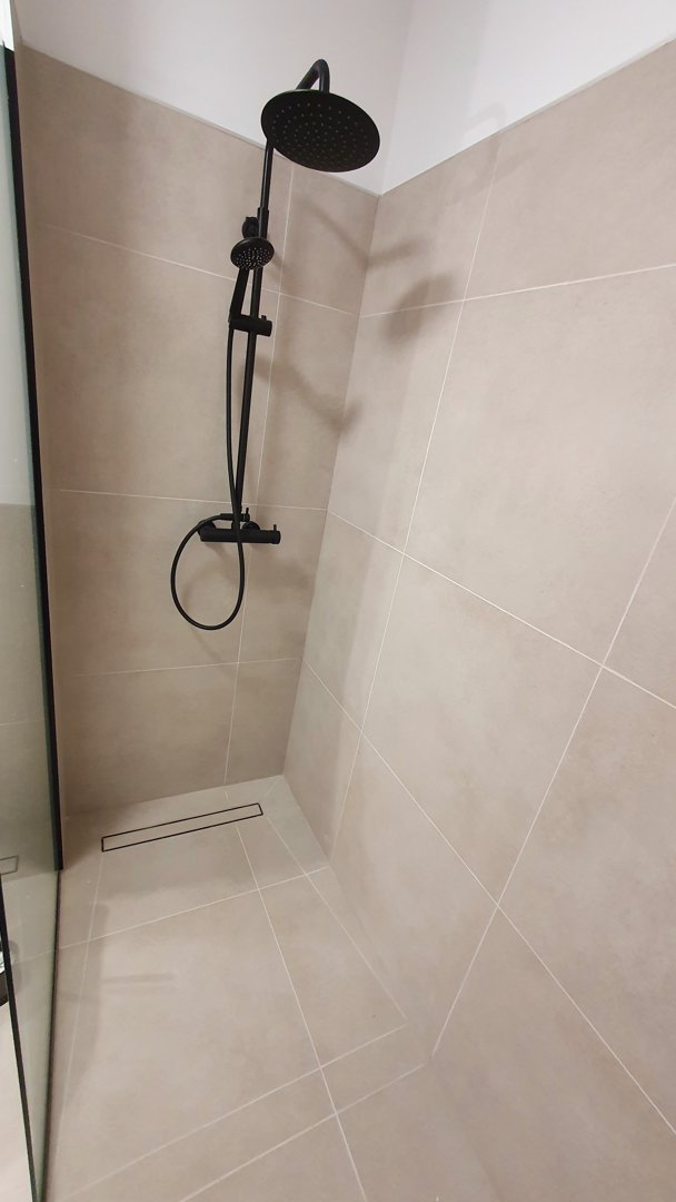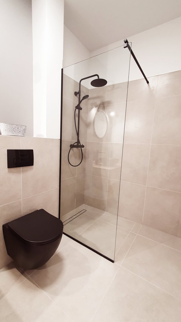 przestronna kabina prysznicowa bezprogowa, umywalka, WC, suszarka do włosów, sprzęt do prasowania - parownica.